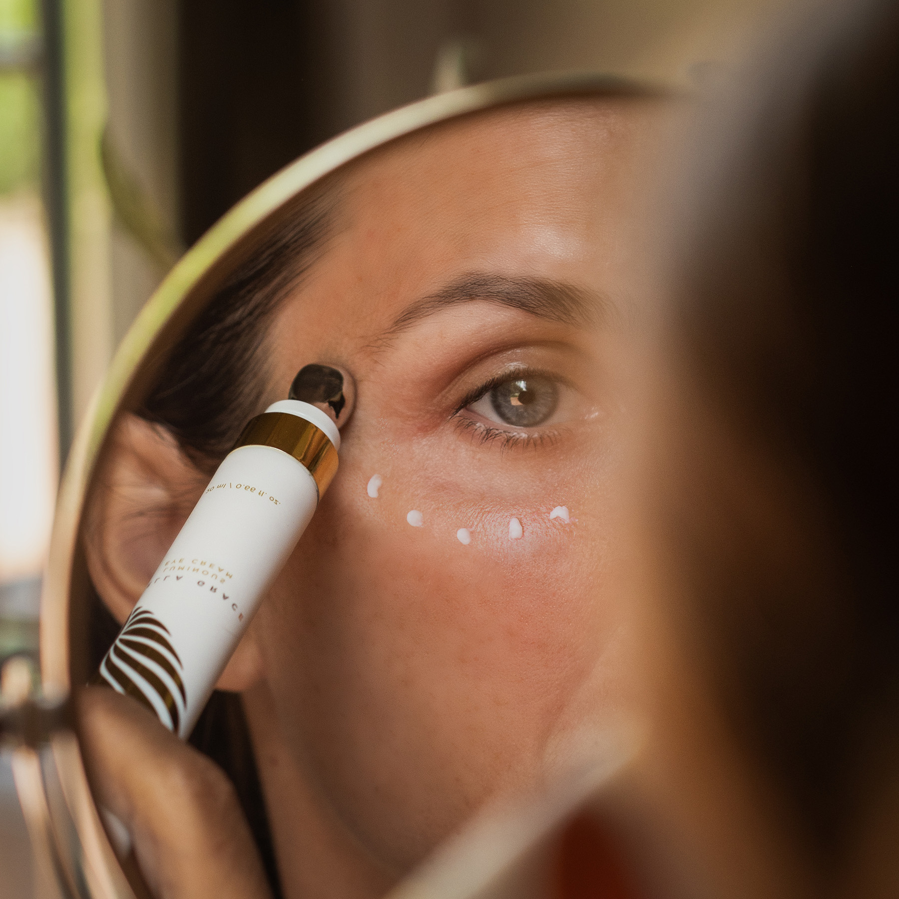 Squeeze a small amount and apply using the cool metal applicator under the eye contour or using your ring finger, gently pat around your eye contour. Start in the outer corner and work inward then bring up around the brow bone until absorbed. Use in the AM and PM.